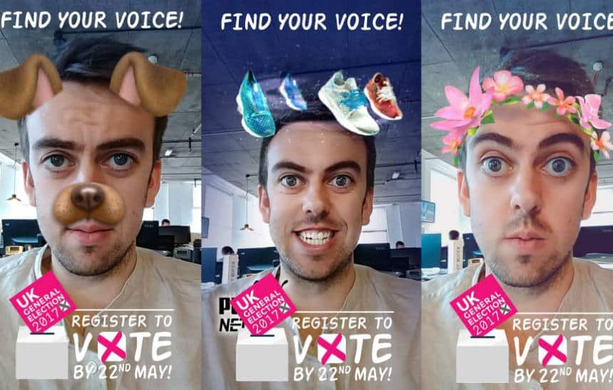 A Comissão Eleitoral do Reino Unido realizou uma parceria com o Snapchat para incentivar os jovens da região a votar nas eleições de 8 de junho. Desde ontem, usuários do aplicativo no Reino Unido podem usar um filtro geográfico especial com a mensagem “Find your voice! Register to vote by 22nd May!” (“Encontre sua voz! Registre-se para votar até 22 de maio”).