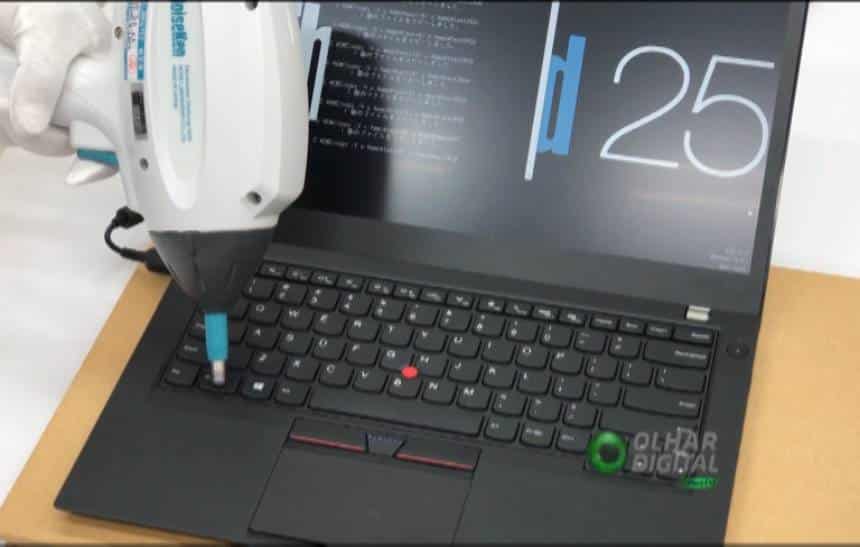 Para avaliar forças sobre a tela, esses braços robóticos passam horas testando o movimento e avaliando as dobradiças do notebook. Esta outra máquina levanta o laptop a pouco mais de um metro e meio do chão antes de soltá-lo em queda livre. Este outro teste dobra o monitor para ter certeza de que a tela não vai quebrar facilmente. E aqui, os pesos de cerca de 20 quilos simulam impactos repetidos sobre a máquina e muita vibração. E, se não bastasse, ainda tem uma prova de queda de canto – um dos acidentes mais fatais para qualquer dispositivo eletrônico.