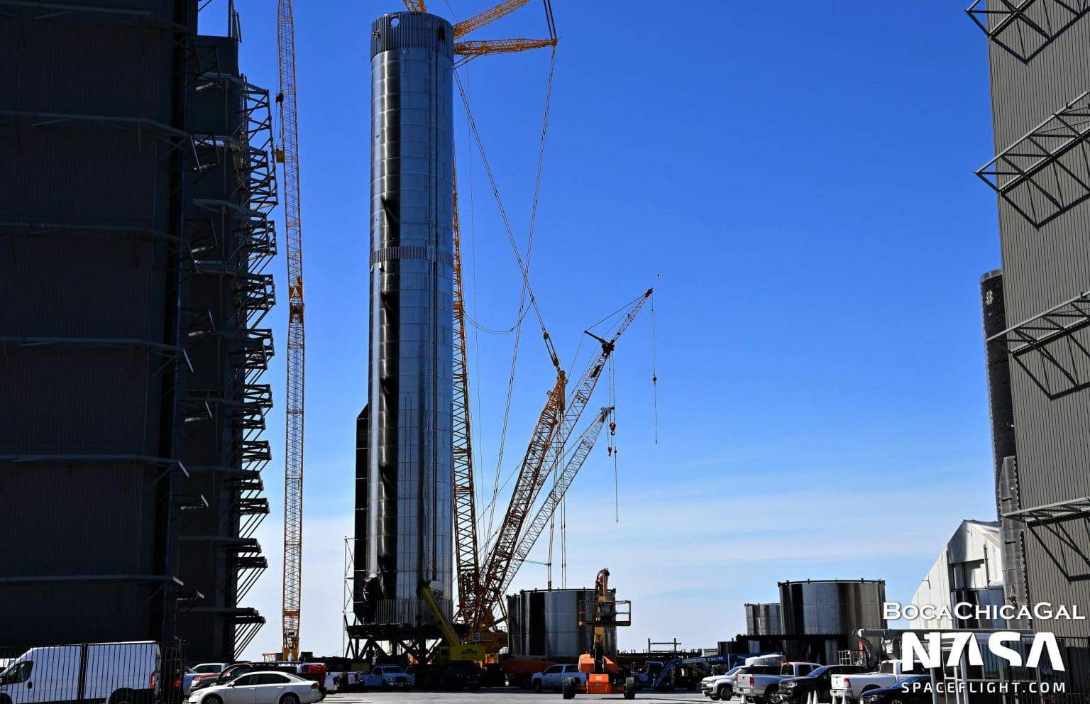 A entrega do foguete se deu hoje (31), alguns dias após a SpaceX decidir tirá-lo em partes da baia alta, apenas para montá-lo fora dela e devolvê-lo à estrutura completamente montado. Paralelamente, um segundo time de engenheiros vinha trabalhando no sítio de lançamento orbital (OLS), uma parte da Starbase adaptada para receber o novo modelo.