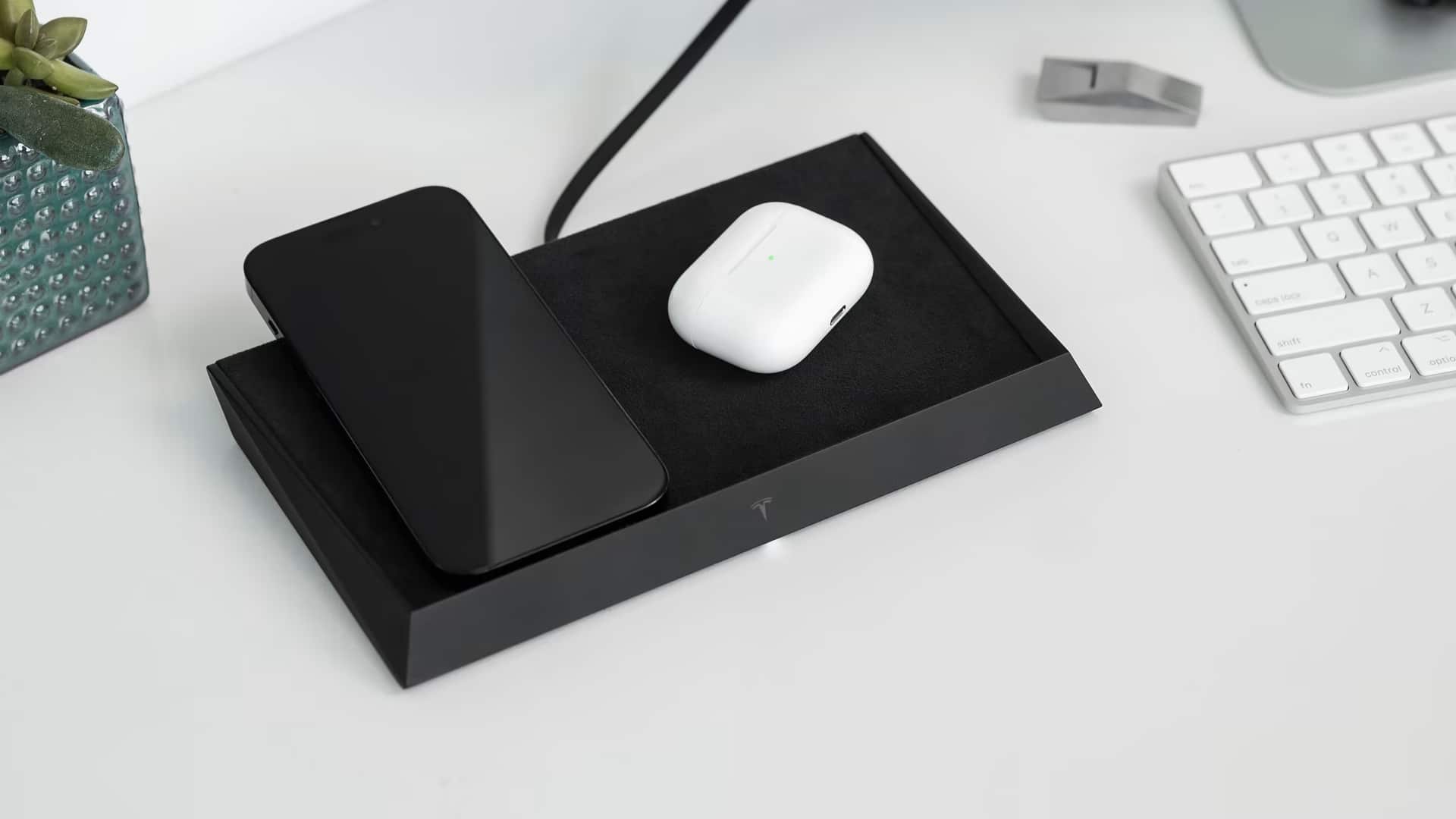 A Tesla conta que o carregador é compatível com qualquer aparelho com carregamento sem fio Qi. O acabamento da superfície de carregamento é em Alcântara, um material feito de poliéster. Outro detalhe interessante é a base magnética destacável, assim você pode usar ele reto ou inclinado.