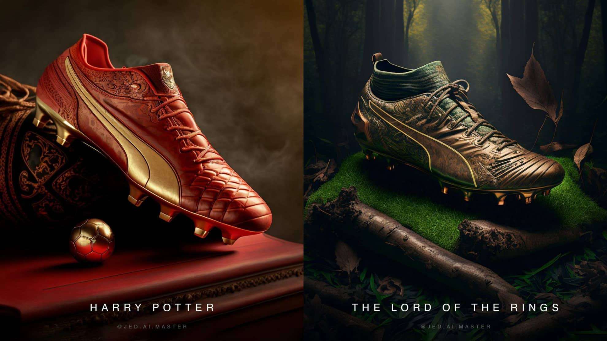 Um dos projetos recentes mostra uma releitura de chuteiras da Puma inspirada em elementos de franquias de sucesso no cinema, como “Harry Potter”, “Jurassic Park” e “O Senhor dos Anéis”.