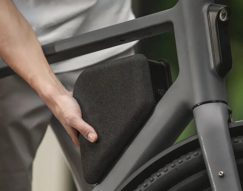 O pacote abriga bateria, controlador do motor e mais recursos eletrônicos no mesmo lugar. Se preferir, o proprietário pode retirar todo o componente da bike e usá-lo basicamente como um potente power bank para carregar o celular, notebook, e mais. A recarga demora cerca de três horas e meia na tomada, segundo a fabricante.