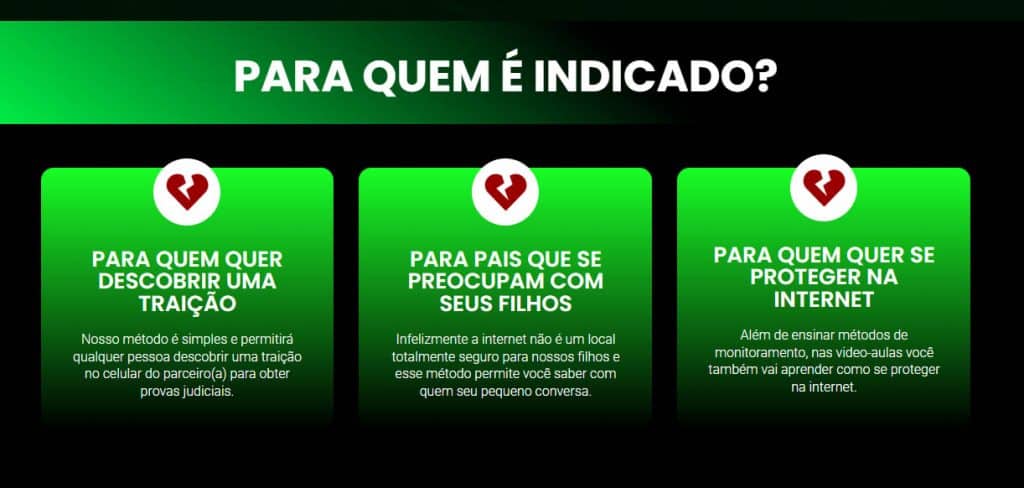 Um desses aplicativos que circula no mercado é chamado “Tempo do Saber” e promete ser um “aplicativo espião que tudo vê”. Ele é oferecido em uma página de vendas onde um vídeo apresenta imagens de mulheres seminuas que supostamente estão sendo acessadas por um smartphone de terceiros. No caso, o primeiro depoimento é de uma mulher que se diz casada com um caminhoneiro e está usando o aplicativo para monitorar tudo o que o marido faz no dispositivo, em busca de comprovar alguma traição.