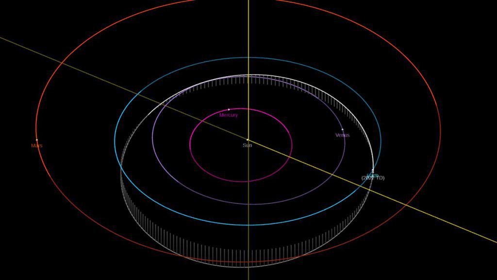 Às 21h15 será a vez do asteroide 2022 TD, que tem aproximadamente 9,4 metros de comprimento estimados. Ele vai passar a 3,4 milhões de km da Terra – ou quase nove distâncias lunares.