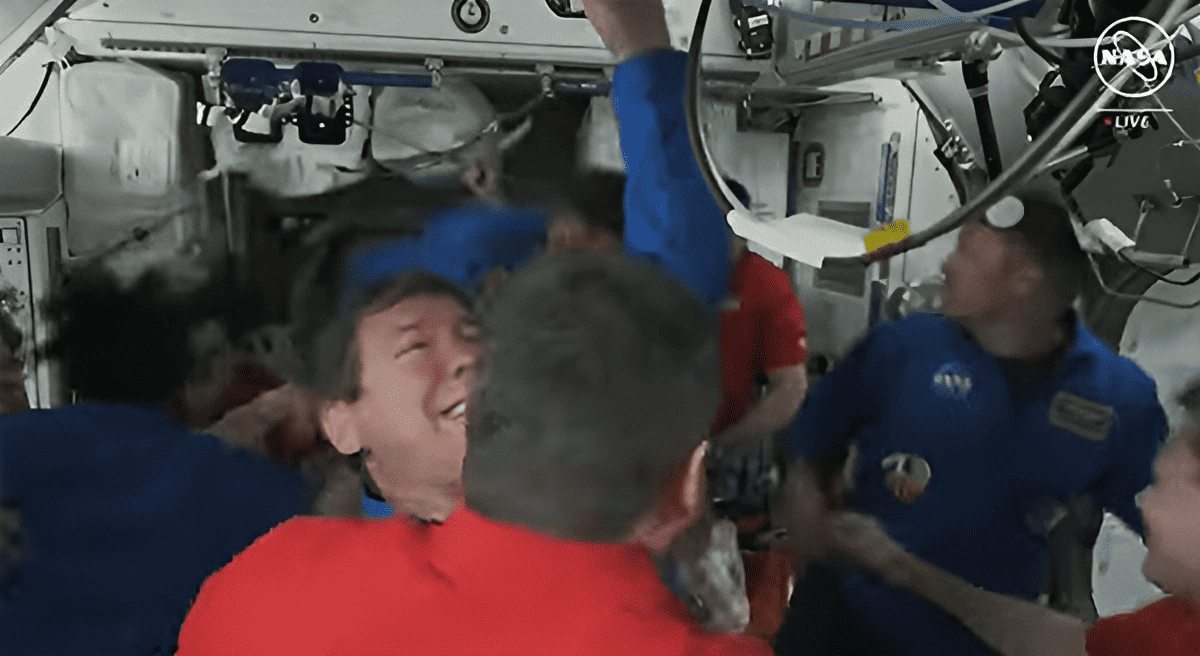 Astronautas da missão SpaceX Crew-8 sendo recebidos na Estação Espacial internacional. Crédito: NASA TV