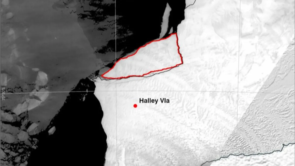 A area demarcada em vermelho mostra o novo iceberg (Crédito: British Antarctic Survey (BAS))