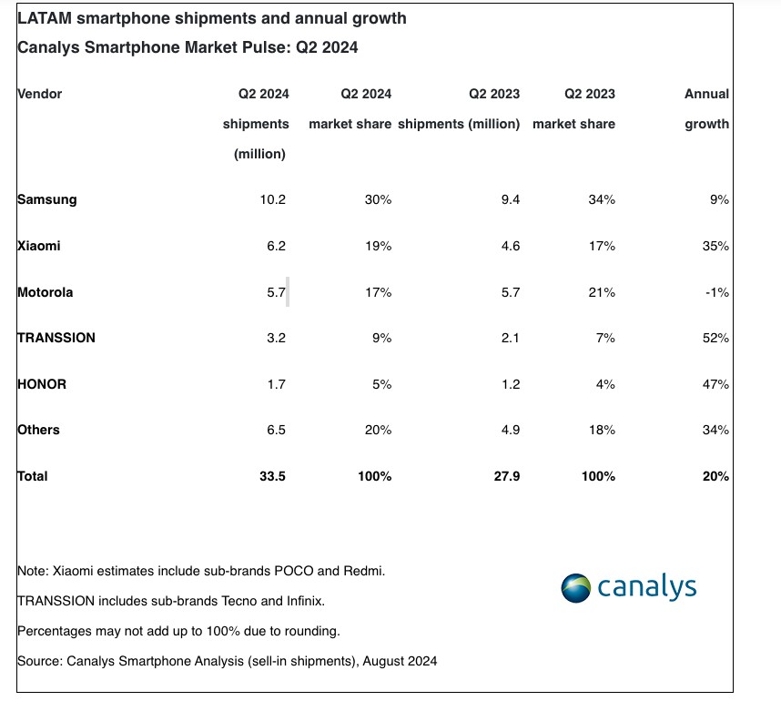 Já a segunda colocação ficou com a Xiaomi. A chinesa cresceu 35% em relação ao mesmo período de 2023 e vendeu 6,2 milhões de smartphones. O resultado fez a companhia ultrapassar a Motorola (5,7 milhões de celulares vendidos) pela primeira vez no mercado latino-americano.