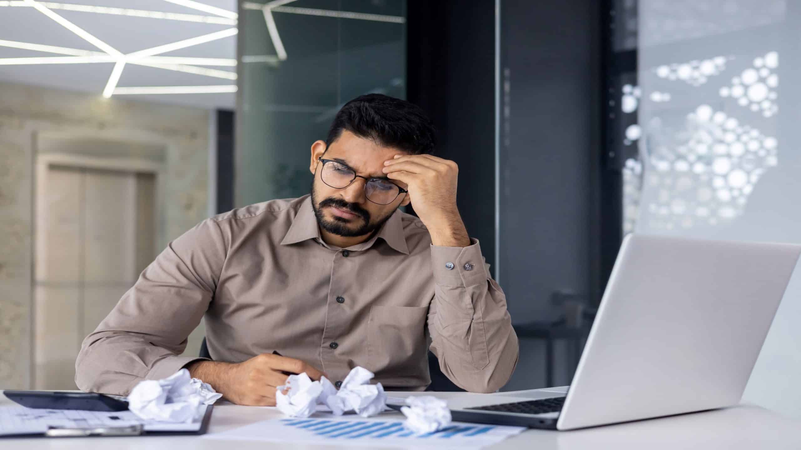 Empresário desapontado, triste e depressivo, sentado entre papéis e documentos amassados dentro do escritório, homem insatisfeito com os resultados, relatórios financeiros ruins /Shutterstock /Foto Voronaman