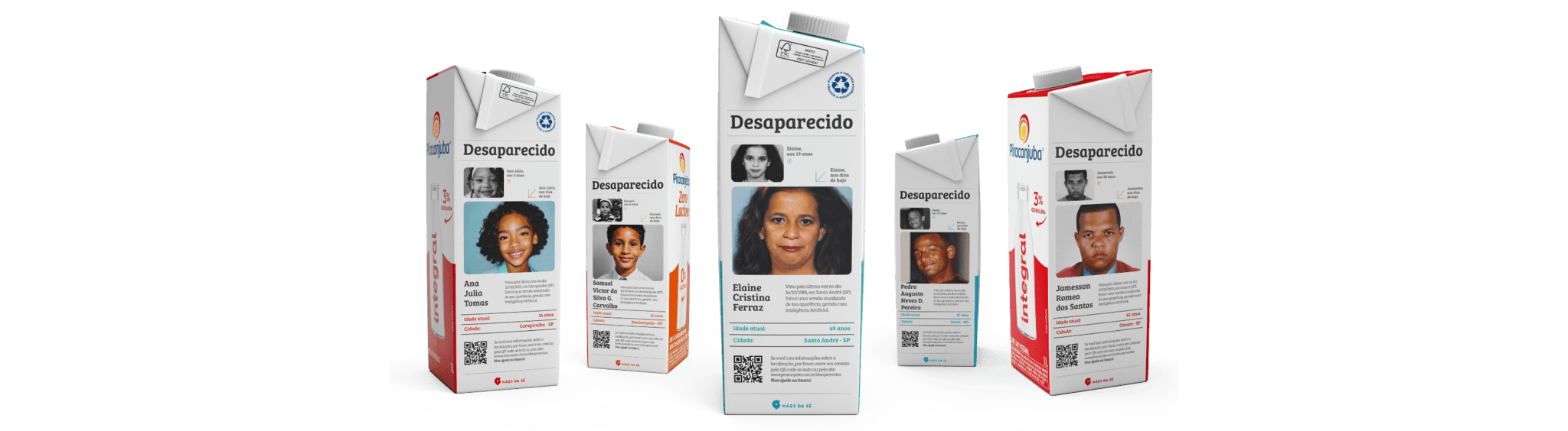 As imagens, feitas a partir de um recurso de progressão de idade gerada pela IA, estampam nas caixas de leite da marca. A embalagem do produto também conta com a idade atual, a informação do último local onde a pessoa foi vista, e uma foto antiga do desaparecido.