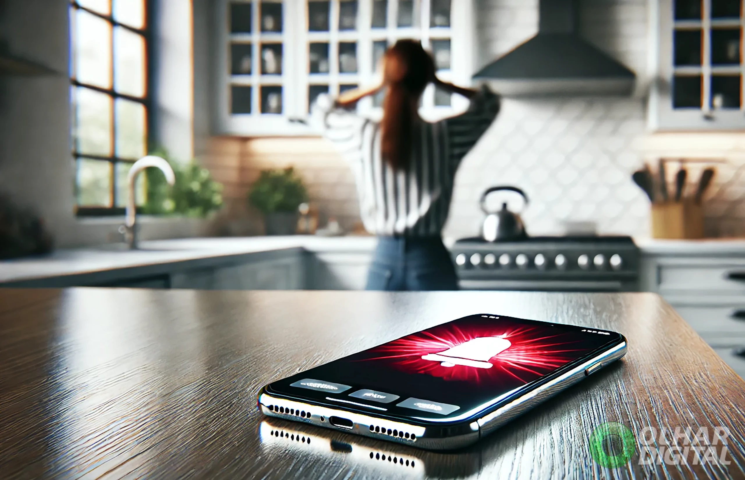 Representação artística elaborada com Inteligência Artificial mostra um smartphone disparando um sistema de alerta em alto volume. Crédito: Flavia Correia via DALL-E/Olhar Digital