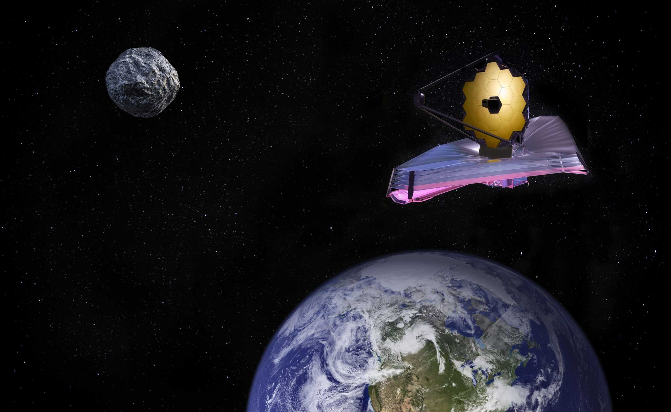 Astrônomos receberam autorização emergencial de direito de tempo de observação do Telescópio Espacial James Webb para analisar o asteroide que representa maior risco de colisão com a Terra atualmente. Créditos: 24K-Production - Shutterstock (fundo/James Webb). Inserção de elementos: Olhar Digital. Terra e asteroide sob licença de Creative Commons.