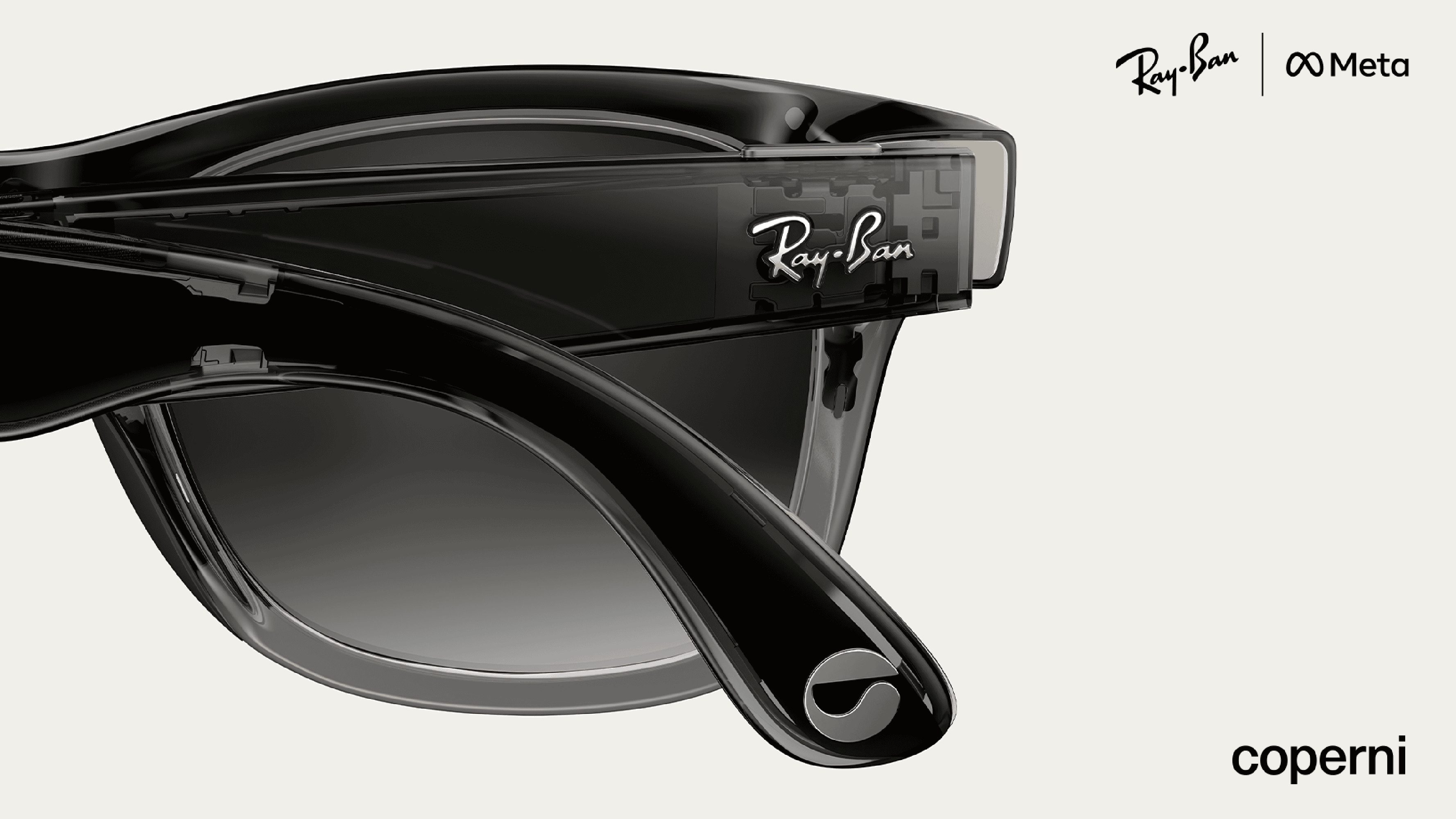 O modelo vem com uma armação Ray-Ban Wayfarer na cor preto transparente, com lentes acinzentadas e logotipo da Coperni nas hastes. Segundo a Meta, é a mistura perfeita de “estilo, design e tecnologia”.