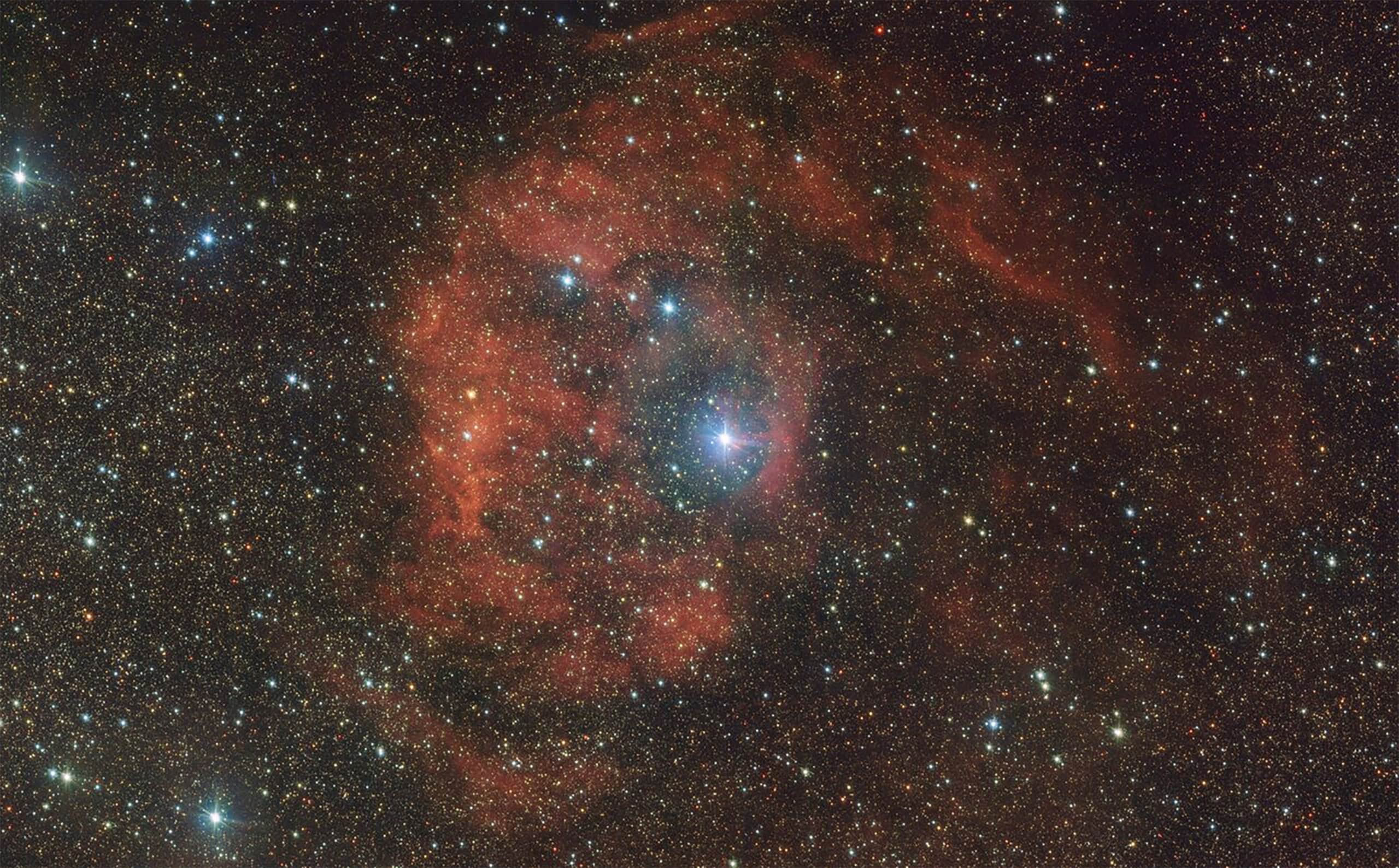 Um verdadeiro ‘intruso cósmico’ foi identificado em uma nova imagem do Very Large Telescope (VLT), instalado no Observatório Europeu do Sul (ESO), no Chile. A foto mostra a nebulosa vermelha Sh2-46, também conhecida como Gum 80, que fica a cerca de 6 mil anos-luz da Terra, na constelação de Serpens. O que mais chama atenção é uma estrela azul e brilhante, que parece dominar o centro da nebulosa.