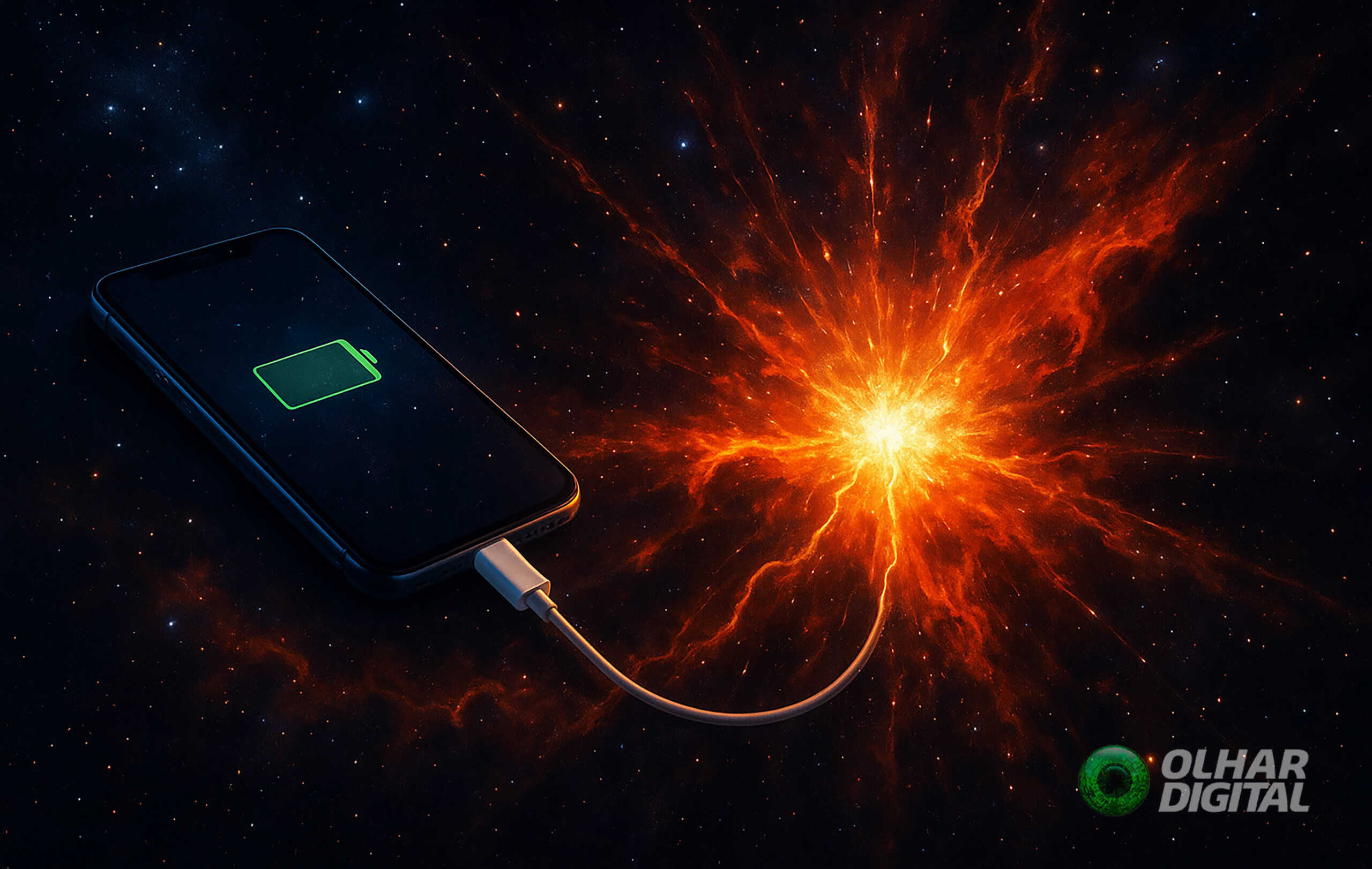 Conceito artístico elaborado com Inteligência Artificial de um smartphone sendo carregado em uma explosão estelar – representando as baterias de íons de lítio. Crédito: Flávia Correia/ChatGPT/Olhar Digital