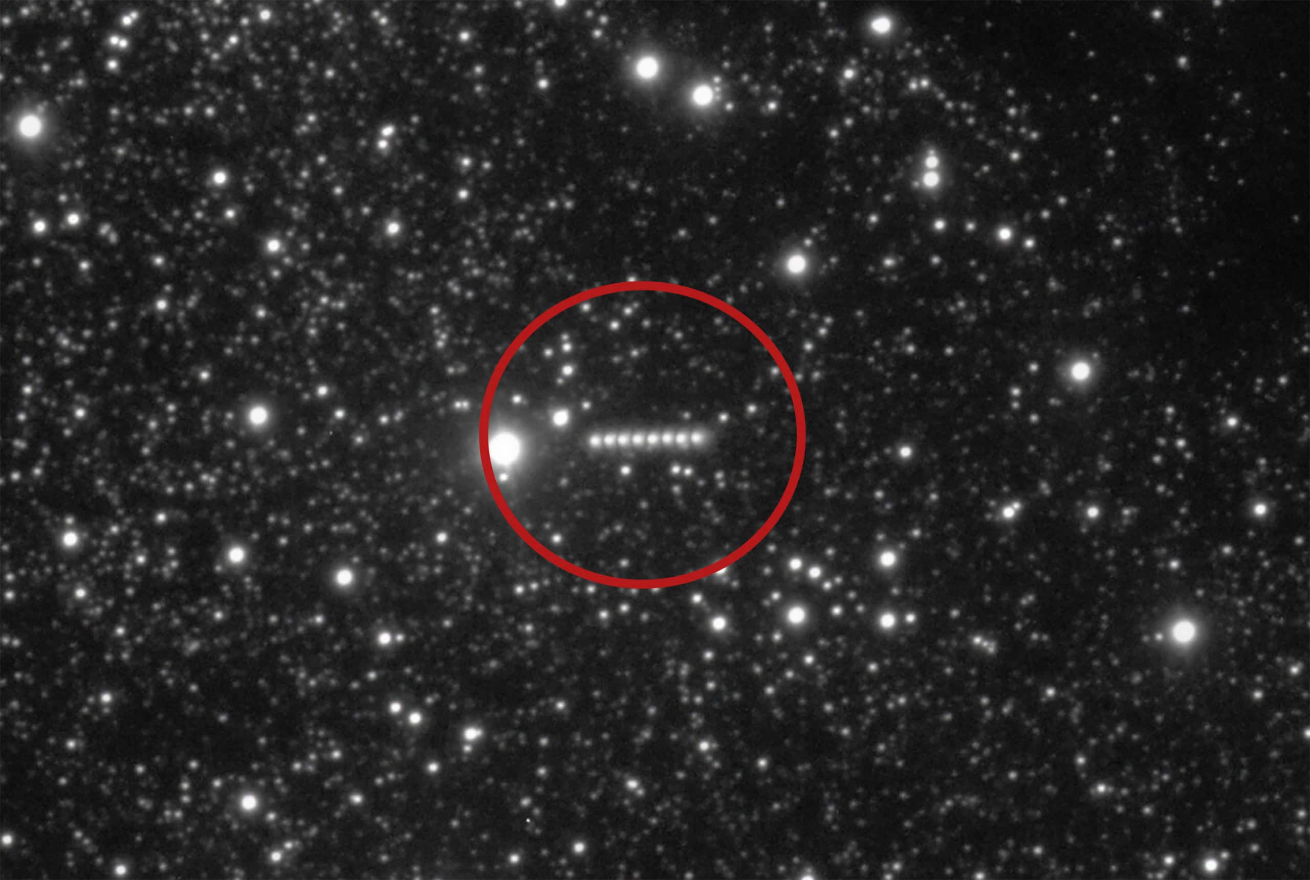 Nesta imagem, várias observações foram sobrepostas, mostrando o cometa 3I/ATLAS como uma série de pontos que se movem para a direita ao longo de cerca de 13 minutos na noite de 3 de julho de 2025. Crédito: ESO/O. Hainaut