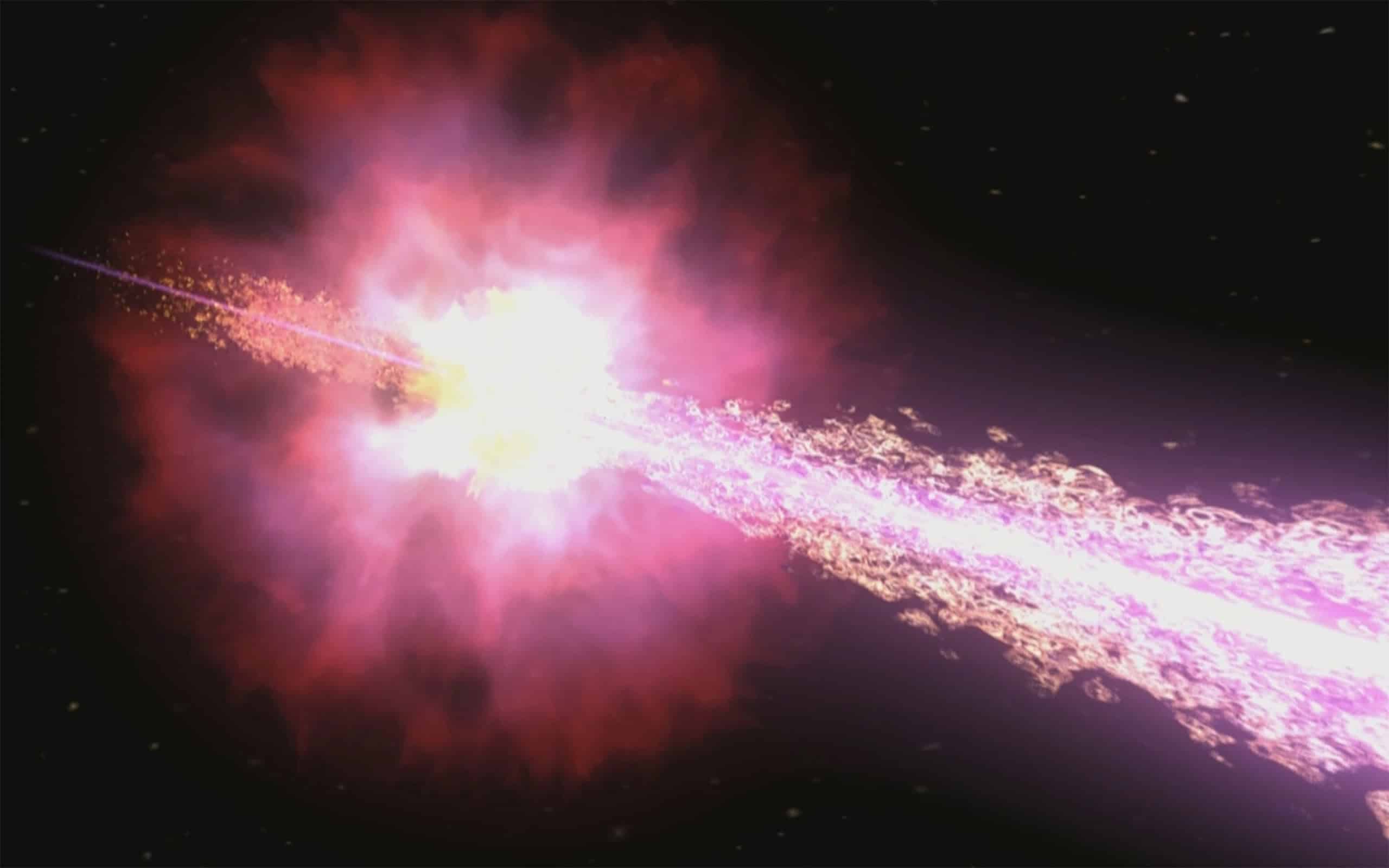 Representação artística de uma explosão de raios gama excepcionalmente brilhante. Crédito: NASA/Swift/Cruz deWilde