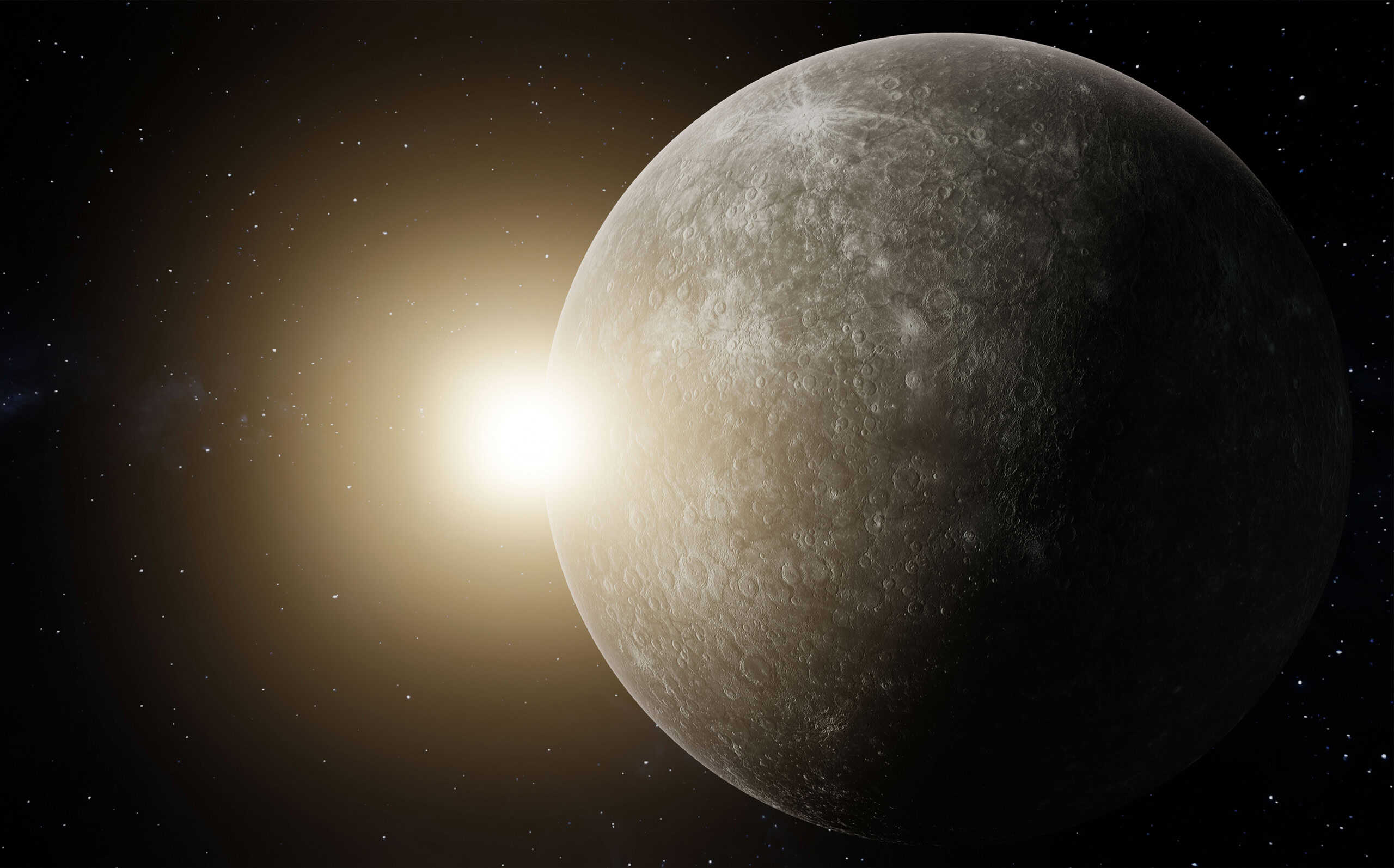 Mercúrio, o menor planeta do Sistema Solar e o mais próximo do Sol, é marcado por calor, radiação e exposição constante ao vento solar. A temperatura local varia de 430°C no lado ensolarado a -180°C no lado noturno. Ele é um pouco maior que a Lua e bem semelhante a ela: sem ar, rochoso e repleto de pequenas e grandes crateras de impacto.