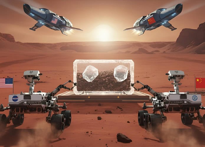 - A China se posiciona para liderar a corrida, planejando lançar sua missão Tianwen 3 no fim desta década com o objetivo de trazer amostras marcianas à Terra em 2031;