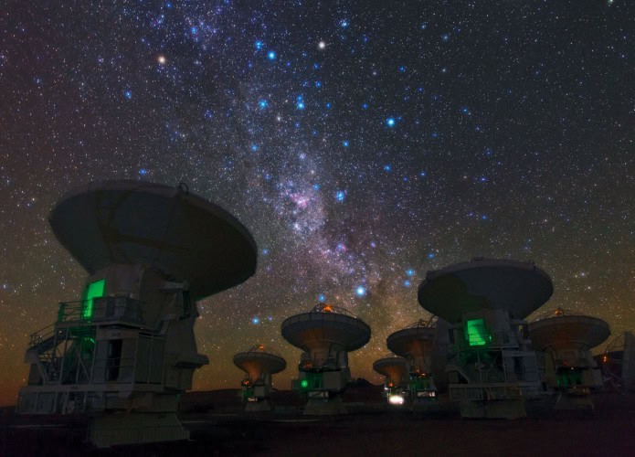 Para os astrofísicos, a potência do ALMA é fundamental à pesquisa. Localizado a 5 mil metros de altitude no deserto do Atacama, ele é composto por 66 antenas metálicas instaladas sobre trilhos. Esse equipamento combina os sinais captados por cada uma delas em um único feixe, o que amplia a sensibilidade das observações.