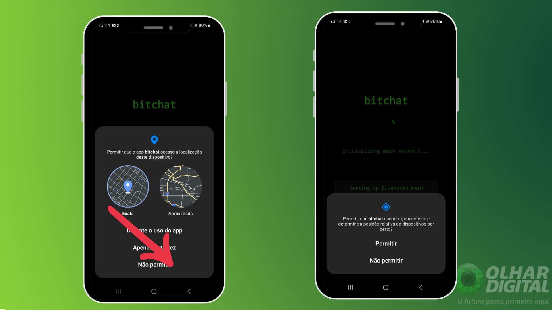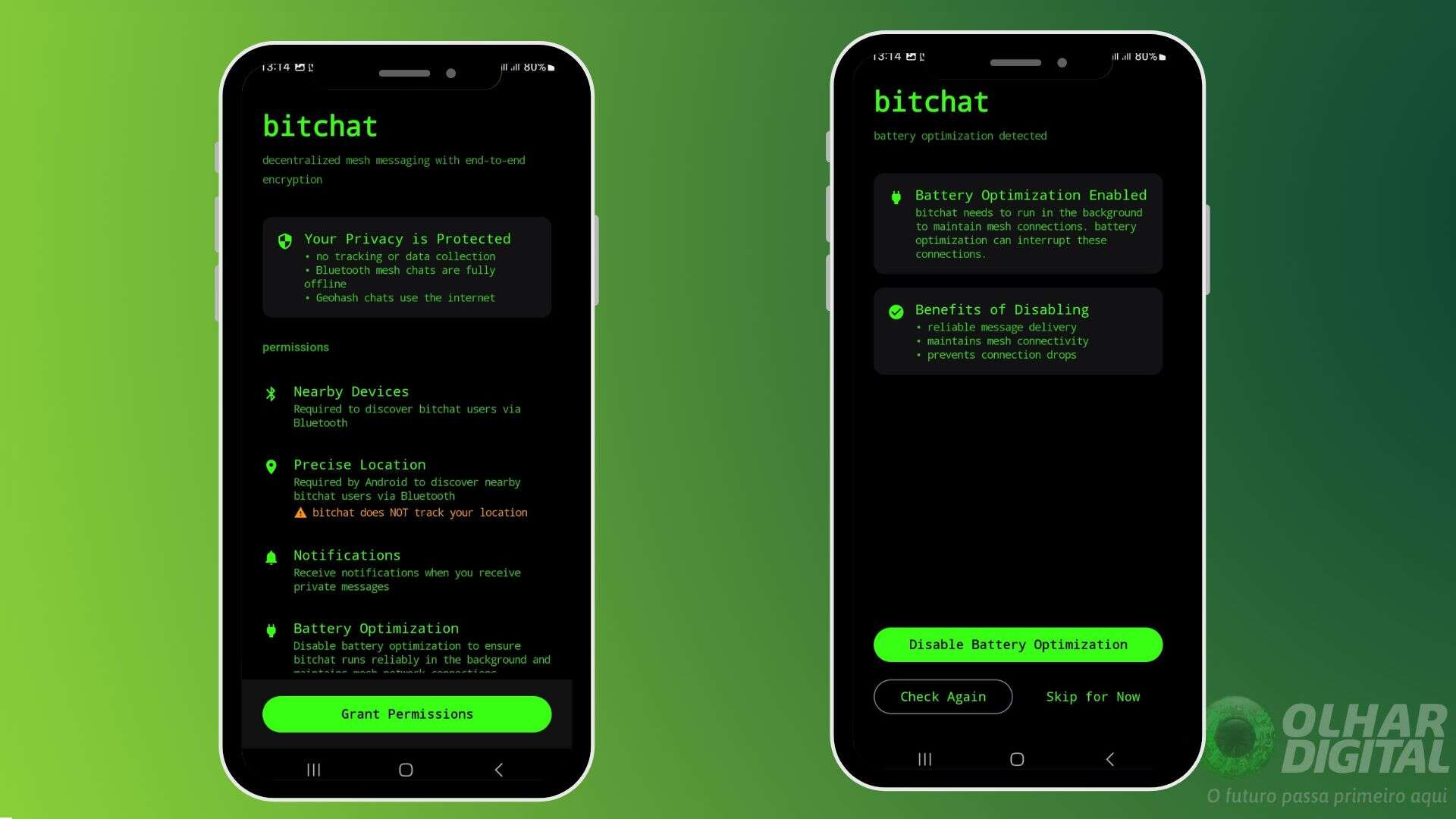 Na tela seguinte, o BitChat vai informar como funciona, quais permissões precisa e também destacar a questão da bateria: é necessário desativar a otimização para que o app funcione corretamente em segundo plano. Siga as instruções na tela.