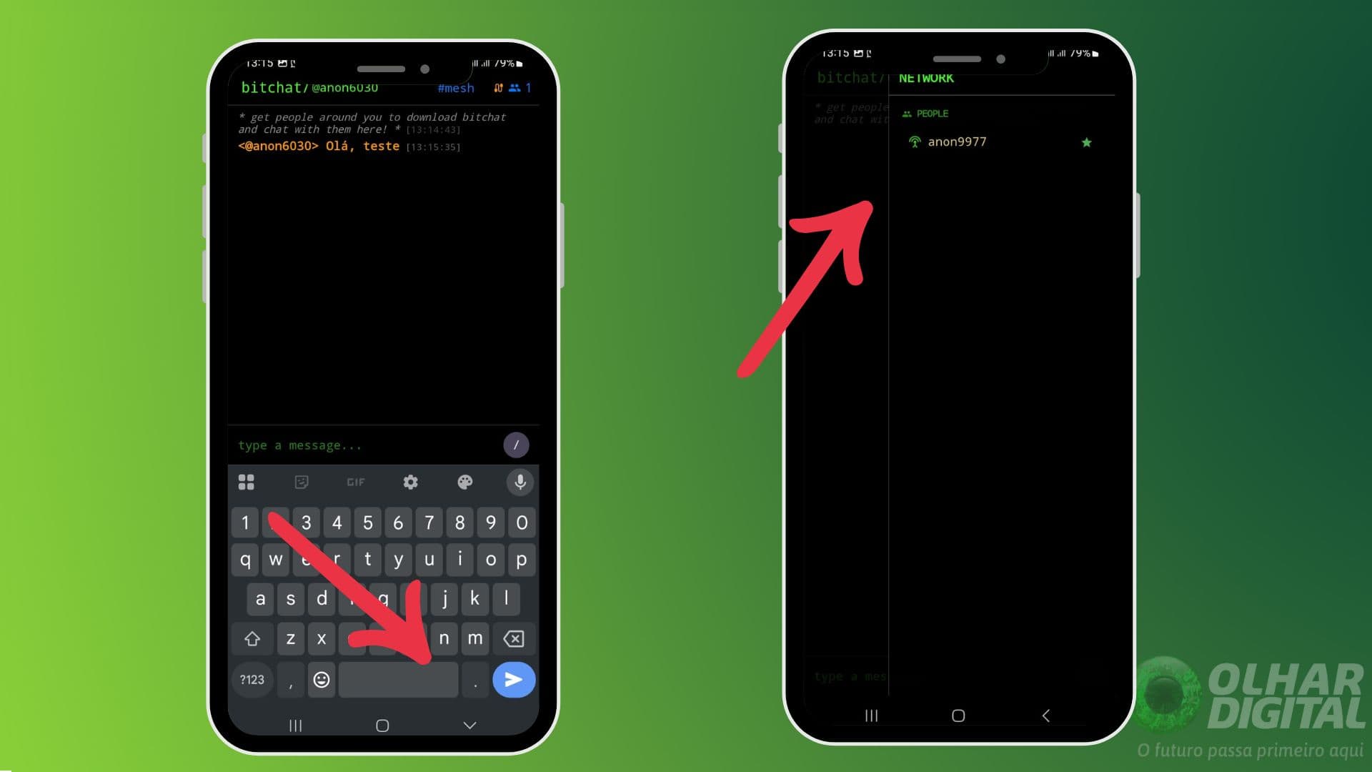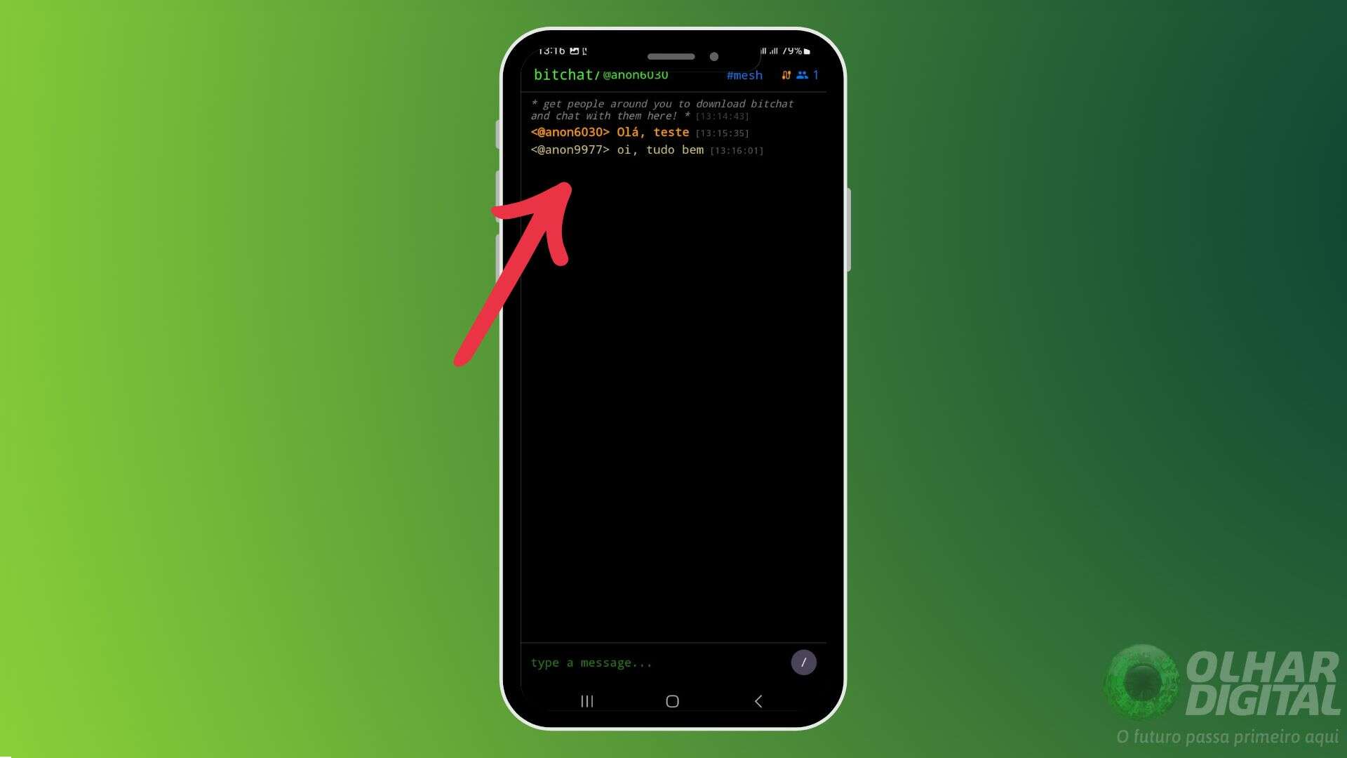 Digite sua mensagem e envie. Se houver alguém conectado na mesma rede mesh, a comunicação acontecerá instantaneamente, mesmo sem internet.