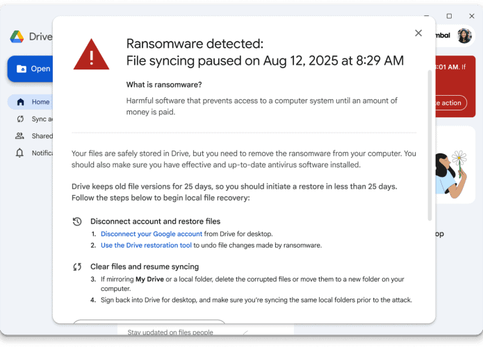 O Google criou um modelo de IA especializado, treinado com milhões de amostras reais de ransomware, para procurar sinais de que um arquivo foi modificado de forma maliciosa. Quando o Drive detecta atividades incomuns que sugerem um ataque de ransomware, ele pausa automaticamente a sincronização dos arquivos afetados. A partir daí, os usuários recebem um alerta em seus desktops e por e-mail, orientando-os a restaurar seus arquivos.