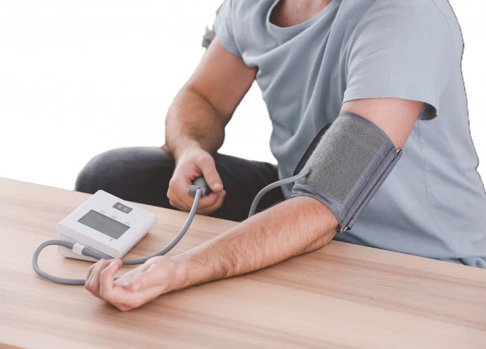 Pessoa medindo a pressão arterial em casa com aparelho digital no braço