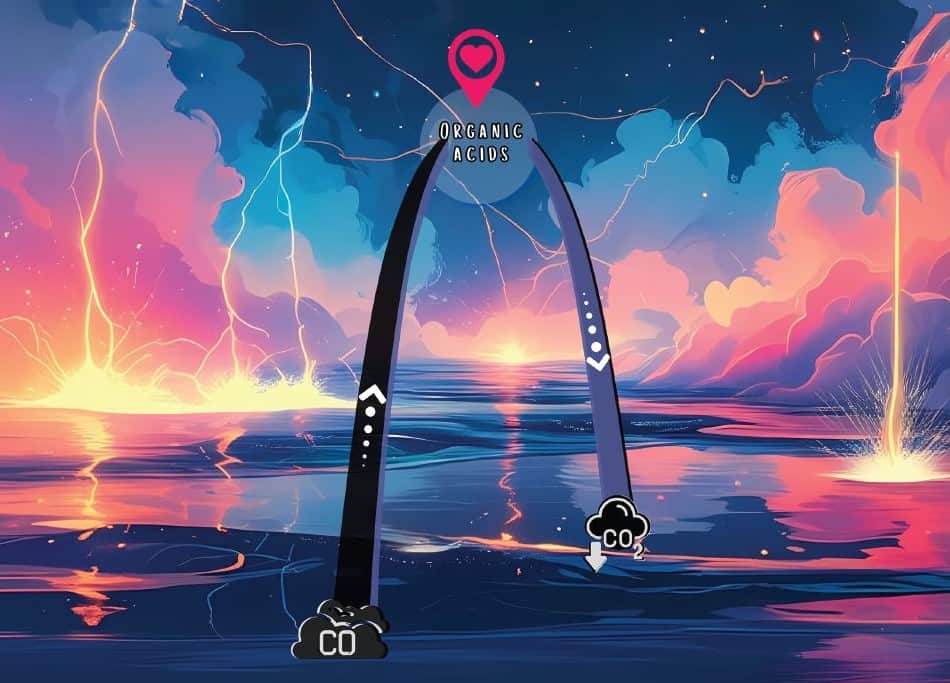 O grupo descobriu que, ao disparar jatos de plasma, o CO em uma solução aquosa passa pela reação de deslocamento de água-gás. Nesse processo, o vapor de água e o CO reagem para produzir hidrogênio e CO₂. Os ácidos orgânicos surgem como intermediários dessa transformação.