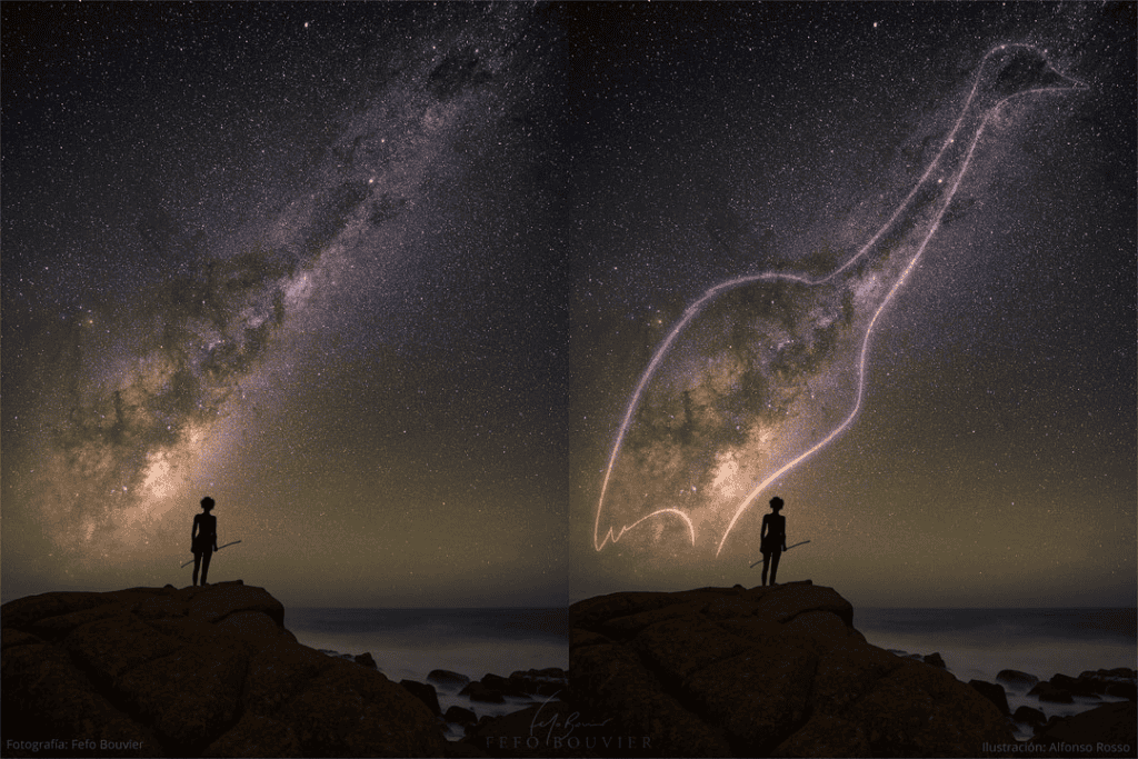 [ Constelação da Ema na cultura tupi, delimitada pelas estrelas e pelas manchas escuras e luminosas da Via Láctea – Créditos: Fefo Bouvier, Alfonso Rosso ]