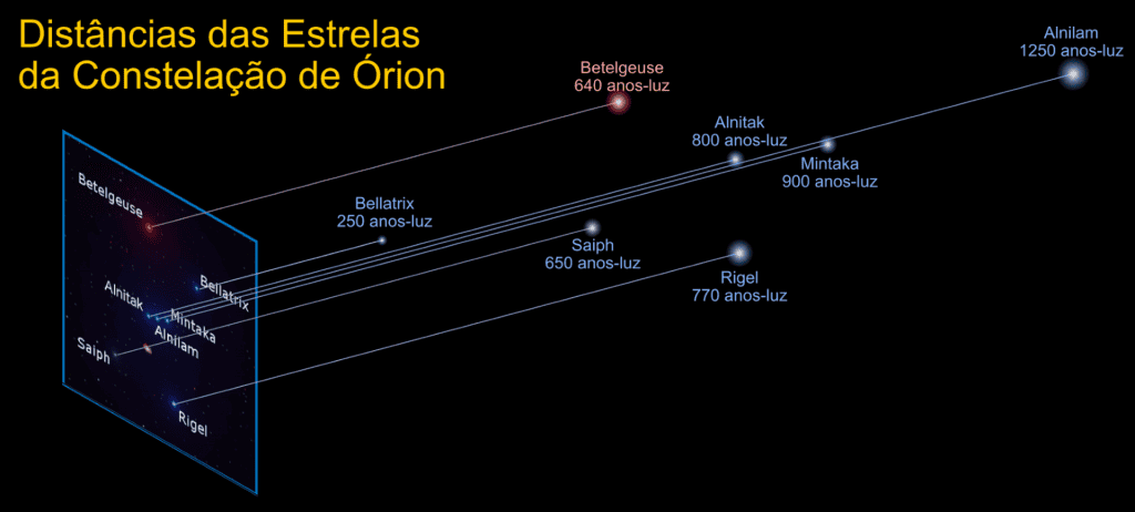 Vistas aqui da Terra, temos a impressão que as estrelas da mesma constelação estão próximas entre si, mas essa é apenas uma ilusão. Órion, por exemplo, um dos conjuntos mais famosos do céu, tem Bellatrix a apenas, 250 anos-luz de distância, Betelgeuse a cerca de 640 anos-luz e Alnilam a 1250 anos-luz da Terra. Para nós, parecem vizinhas — mas no espaço, estão mais afastados que alguns familiares depois das últimas eleições.