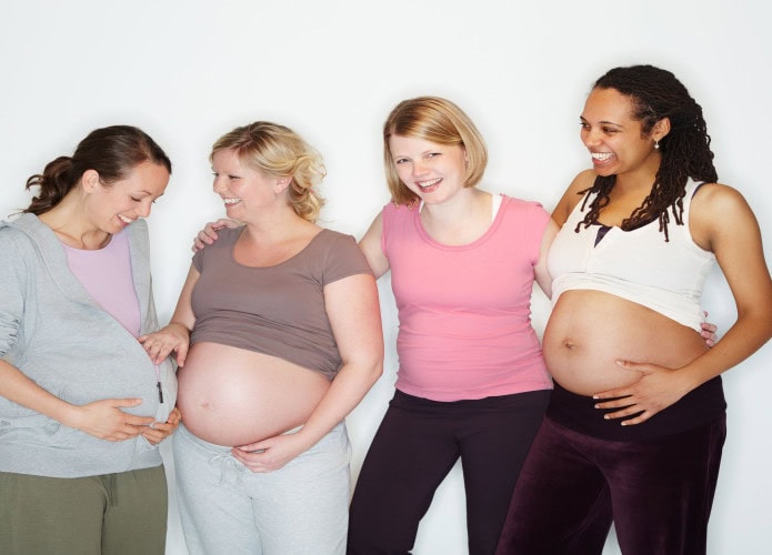 Imagem mostra Grupo de amigas grávidas em estúdio contra um fundo branco