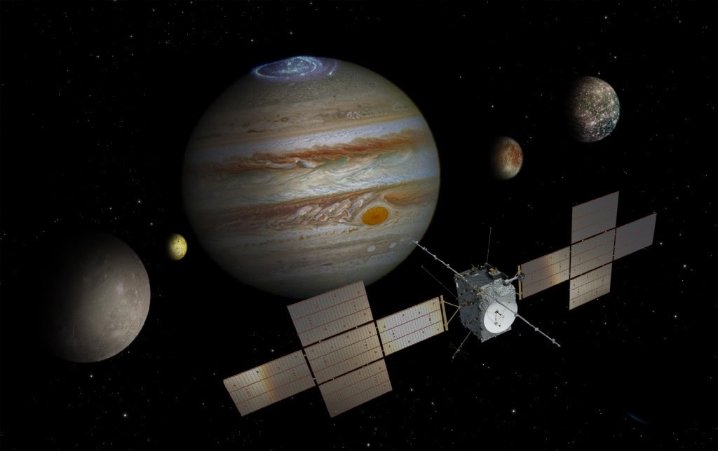 Projetada para investigar Ganimedes, Calisto e Europa (três luas de Júpiter que provavelmente escondem oceanos sob o gelo), a sonda JUICE deve entrar no sistema joviano no início da próxima década e se tornar a primeira espaçonave a orbitar uma lua de outro planeta – Ganimedes, a maior do Sistema Solar e única com campo magnético.
