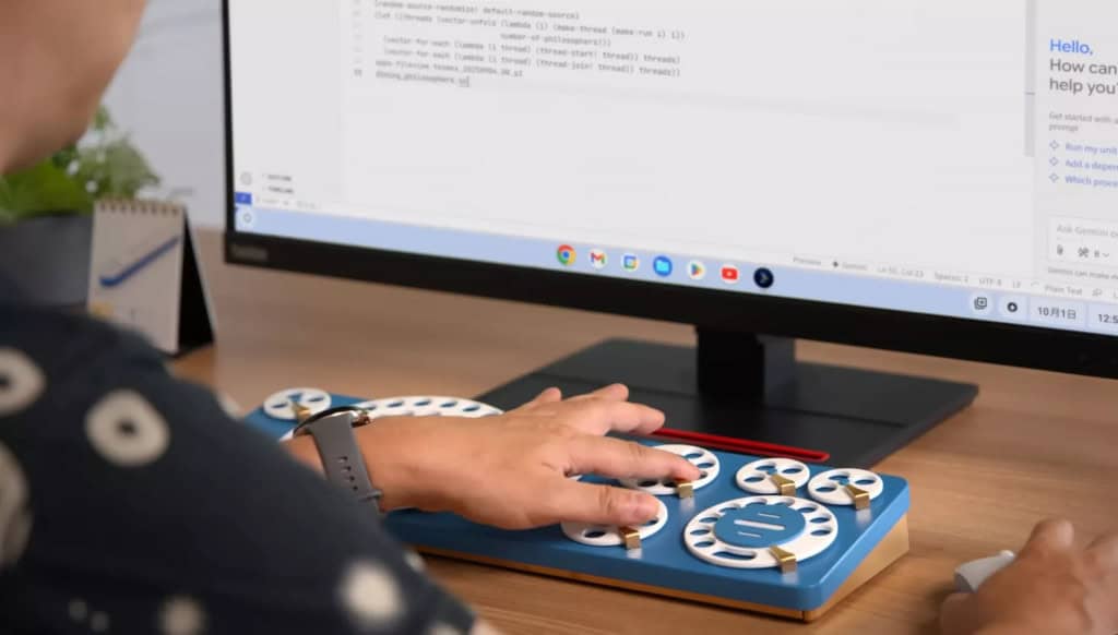 - O teclado substitui as fileiras tradicionais de teclas por discos circulares descentralizados.