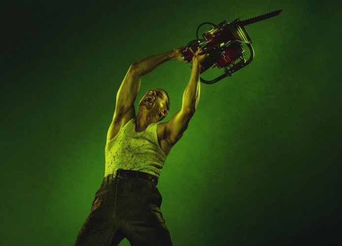Outro plano marcante mostra Ed Gein erguendo uma serra elétrica e dançando no ar, em clara referência ao final de “O Massacre da Serra Elétrica”, de Tobe Hooper. O recurso reforça a ligação direta entre o personagem real e suas “versões cinematográficas”.