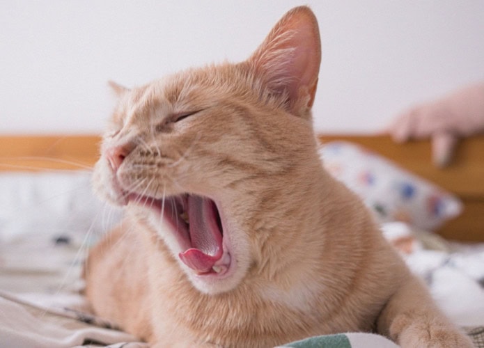 Gato bocejando em cima de uma cama - Imagem: Wirestock Creators/Shutterstock