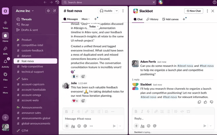 Antes limitado a enviar lembretes e notificações, o bot foi “reconstruído do zero como um companheiro de IA personalizado”, afirmou Rob Seaman, diretor de produtos do Slack na Salesforce, ao The Verge.