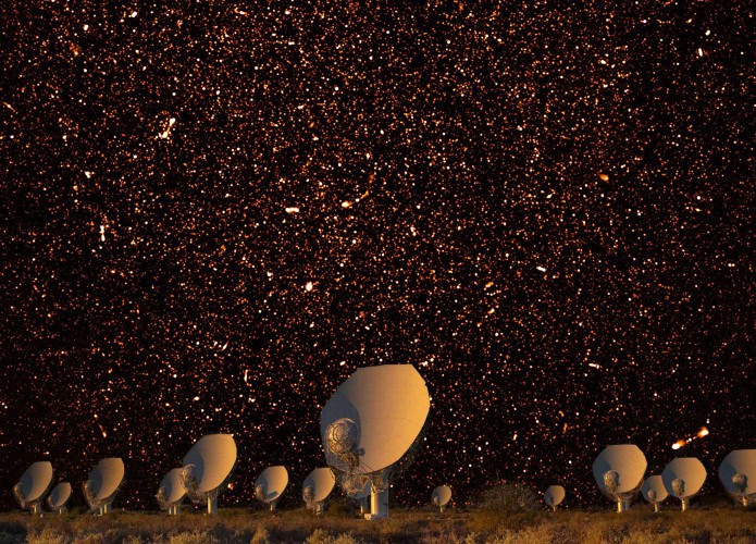 Imagem composta mostra milhares de galáxias em formação de estrelas em luz de rádio e o conjunto de radiotelescópios MeerKAT no semideserto sul-africano do Karoo. Como as ondas de rádio viajam à velocidade da luz, esta imagem é uma máquina do tempo que coleta amostras da história da formação estelar do Universo. Crédito: SARAO / NRAO / AUI / NSF.