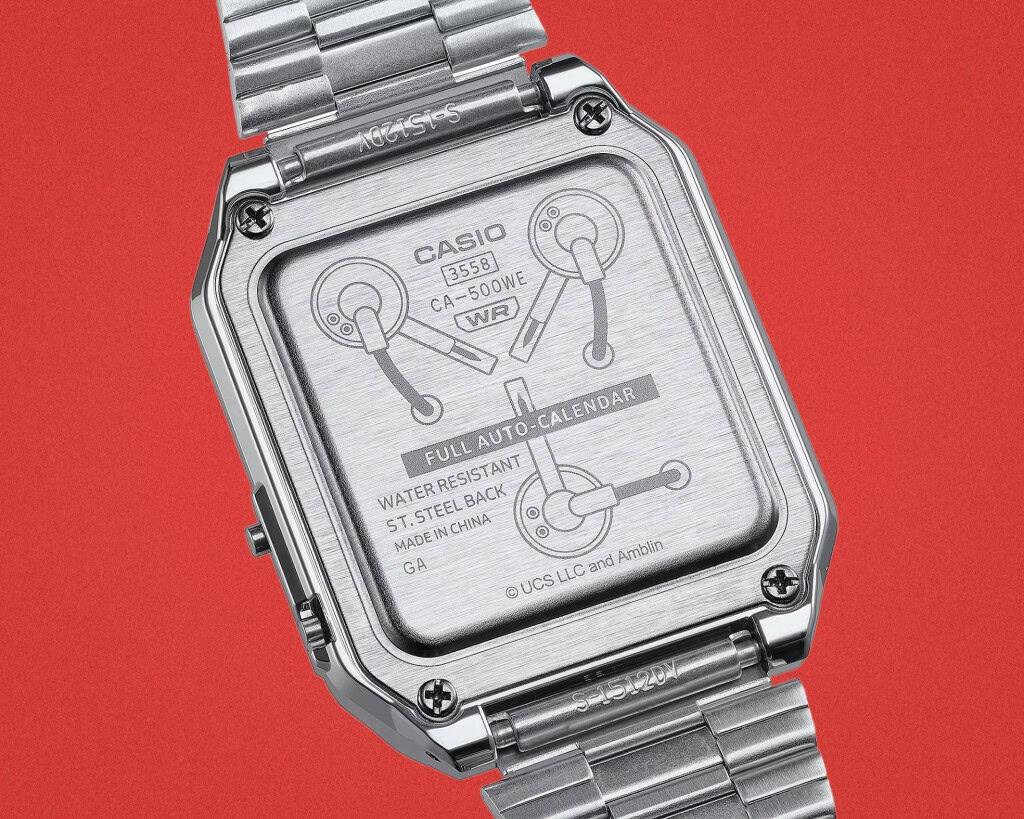 O Casio De Volta para o Futuro x CA-500WEBF-1A é uma edição especial para fãs. Mantém o visual retrô, mas adiciona detalhes inspirados no DeLorean, segundo o site Gear Patrol.