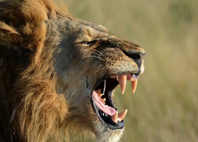 Leão com as presas a mostra / Crédito: James Bloor Griffiths (shutterstcok/reprodução)