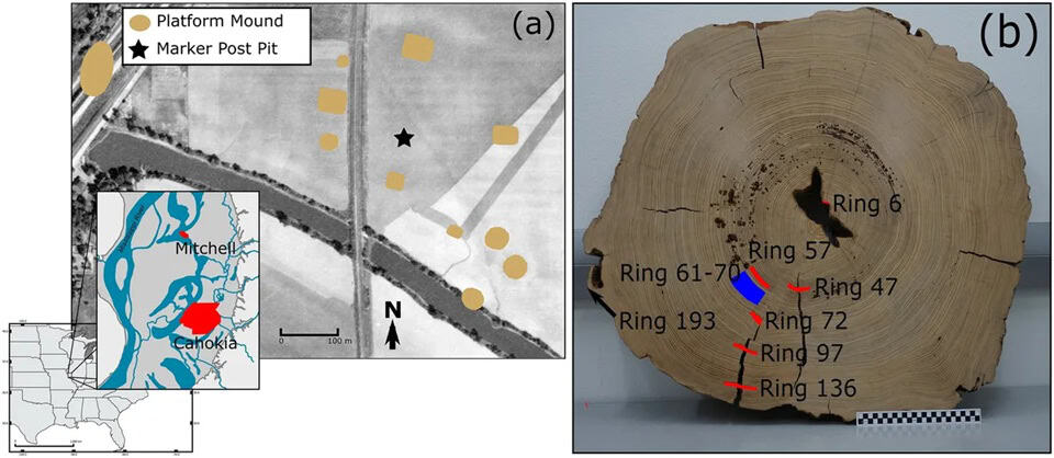A equipe responsável pelo trabalho explica que a cidade de Cahokia atingiu o seu pico entre os anos de 1050 e 1200. Durante esse período, a população ergueu grandes estruturas monumentais chamadas postes de marcação. Eles foram talhados em enormes troncos de árvores e normalmente colocados perto de pátios comunitários, no topo de montes de pirâmides e em edifícios proeminentes.