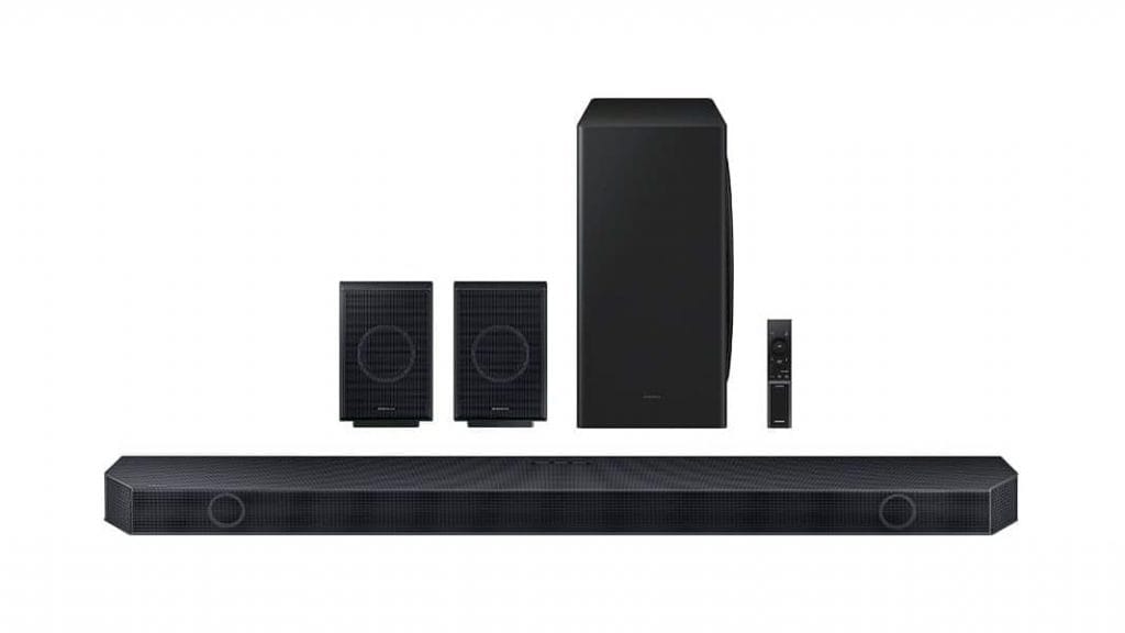 A soundbar Samsung HW-Q930D é composta por 9.1.4 canais, o que significa nove alto-falantes frontais e laterais, um subwoofer dedicado aos sons graves e quatro canais verticais responsáveis pelos efeitos de altura.