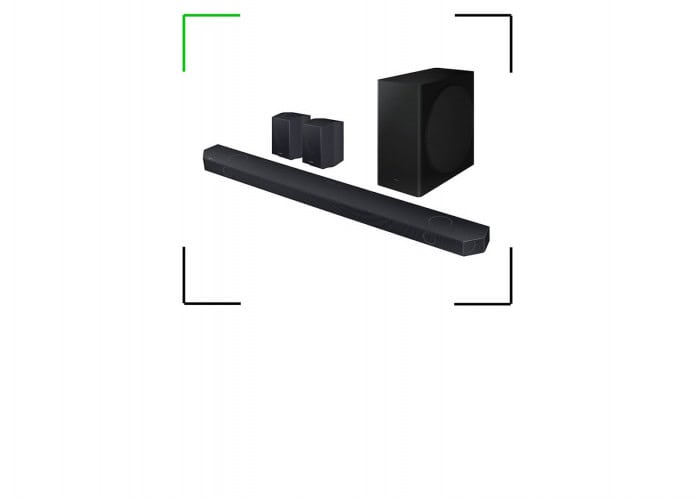 A soundbar Samsung HW-Q930D é composta por 9.1.4 canais, o que significa nove alto-falantes frontais e laterais, um subwoofer dedicado aos sons graves e quatro canais verticais responsáveis pelos efeitos de altura.