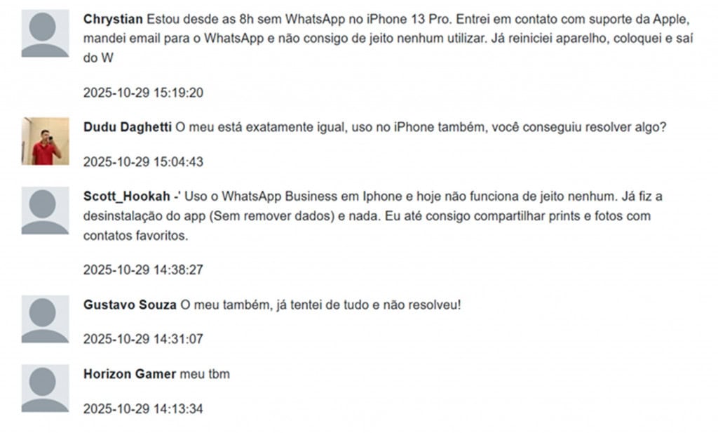Na própria página do WhatsApp no Downdetector, usuários registraram suas queixas na sessão de comentários. Um deles relatou estar sem acesso ao aplicativo desde às 8h no iPhone 13 Pro. Outros também relataram que o problema era em dispositivos iPhone.