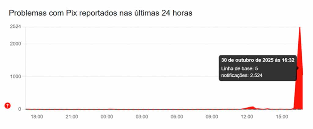 O Downdetector, plataforma que monitora o funcionamento de sites e aplicativos, registrou aumento nas reclamações a partir das 16h (horário de Brasília). Às 16h32, já eram mais de 2.500 registros de erros no Pix.
