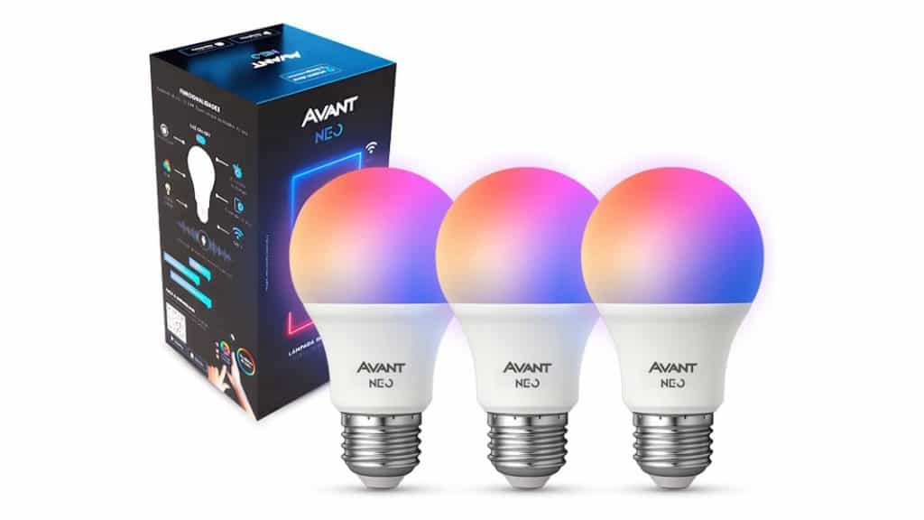 As lâmpadas inteligentes AVANT NEO Smart LED oferecem potência de 10W e conexão Wi-Fi, permitindo controle por voz via Alexa ou Google Home. O modelo é dimerizável e ajusta tanto o brilho quanto a cor (RGB), possibilitando diferentes cenários de iluminação. O soquete E27 facilita a instalação em luminárias comuns, e o aplicativo Tuya permite configurar rotinas e temporizadores pelo smartphone.