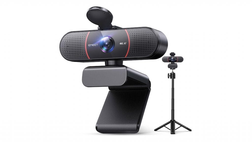 O visual da EMEET C960 4K é discreto e moderno, com corpo compacto que pode ser usado sobre o monitor, o notebook ou no tripé que acompanha o kit. A conexão é via USB, então basta plugar e usar.