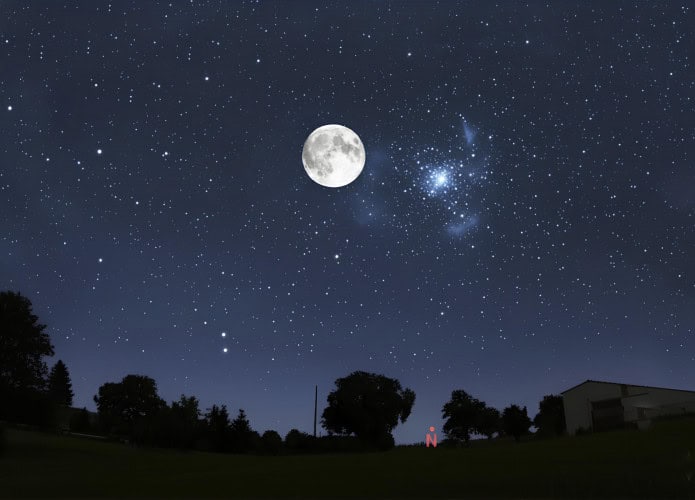 A Lua estará com magnitude -12.8, e a de M45 será 1.3, com ambas localizadas na constelação de Touro. Quanto mais brilhante um objeto parece, menor é esse valor (relação inversa). O Sol, por exemplo, que é o corpo mais brilhante do céu, tem magnitude aparente de -27.