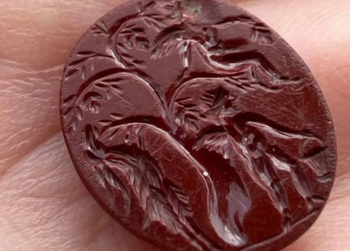 - De acordo com o portal Live Science, a pedra apresenta um tom avermelhado e provavelmente foi criada como parte de um anel romano usado para o carimbo de correspondência pessoal.
