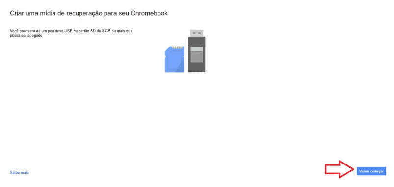 O sistema irá solicitar um pendrive ou cartão SD para criar a unidade de instalação. Basta clicar em “Começar” assim que plugar a mídia no computador.