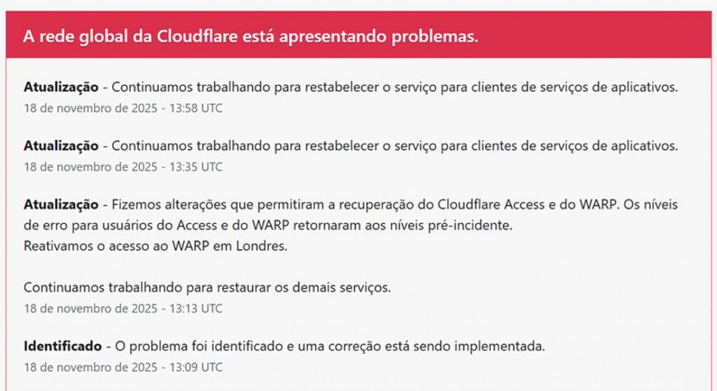 A Cloudflare mantém uma página de status, por onde atualiza o funcionamento de seus servidores. A empresa escreveu que se trata de um erro generalizado que está afetando vários clientes e que estava investigando o problema.